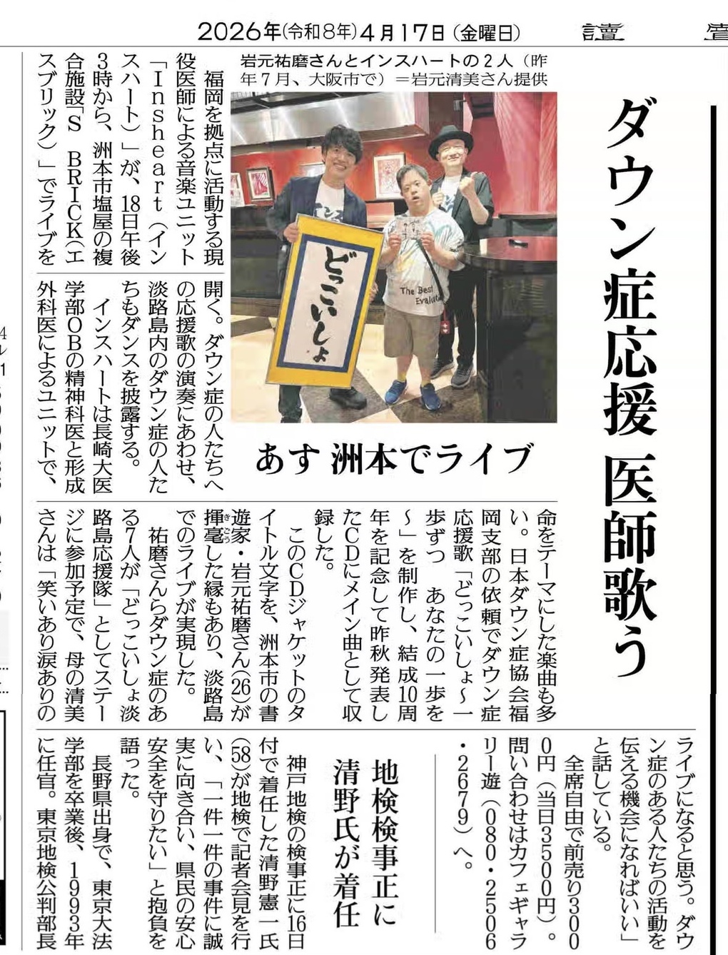 讀賣新聞に掲載いただきました! 明日は、 活動を始めて以来、初めての地「淡路島」でのコンサート。 11年前に活動を始めた頃には想像もできなかったような場所まで、 音楽が僕たちを連れてきてくれました。 僕たちを呼んでくださること。 僕たちの音楽を聴きたいと思ってくださること。 その一つひとつが、本当にありがたくて、 心から嬉しいです。
